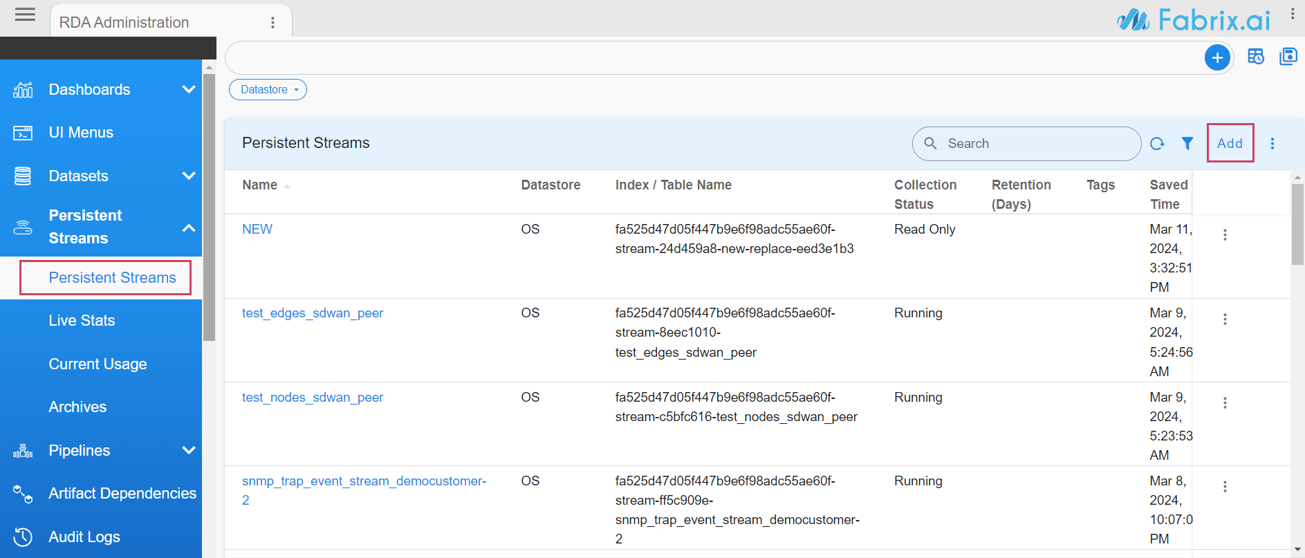 Login into RDAF UI portal and go to Main Menu --> Configuration --> RDA Administration --> Persistent Streams