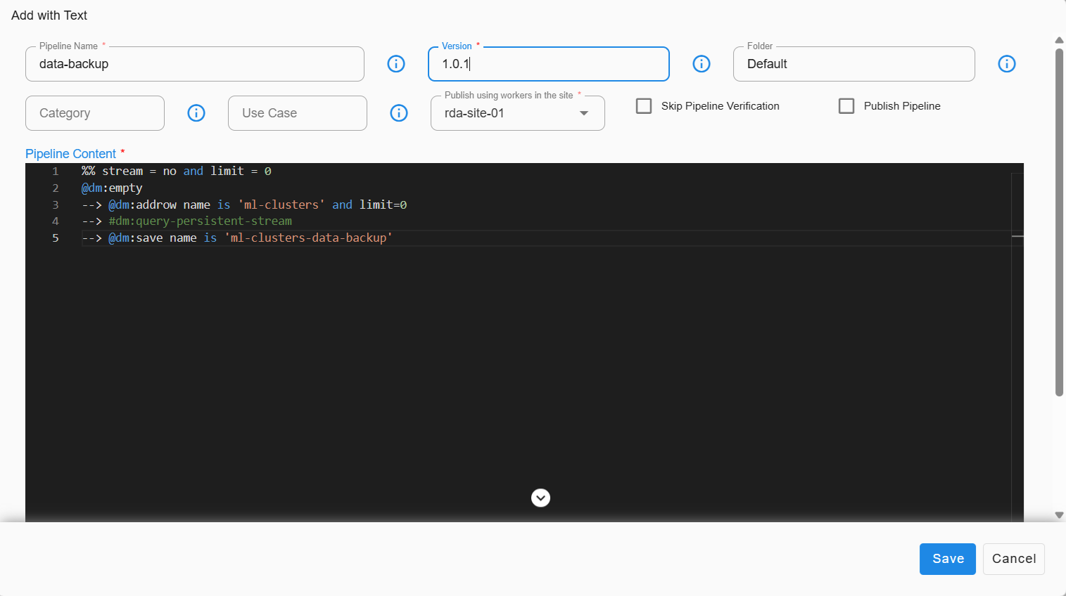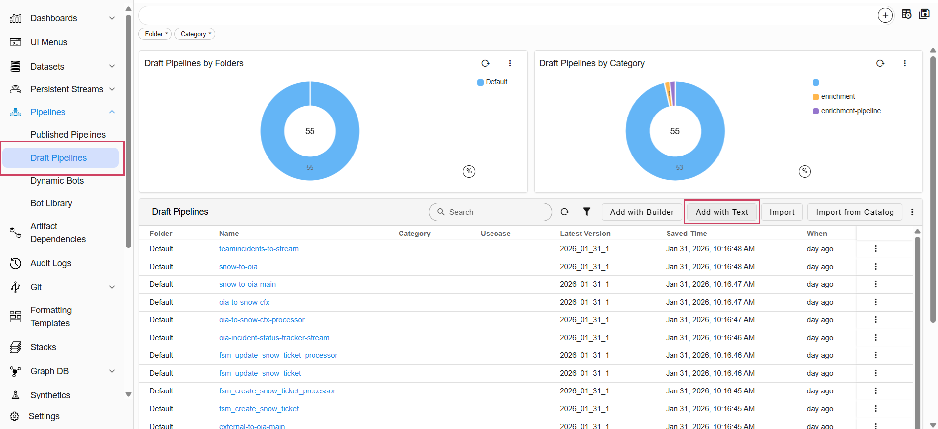 - Go to Home → Navigate to the Configuration -> RDA Administration -> Pipelines -> Draft Pipelines -> Add with Text