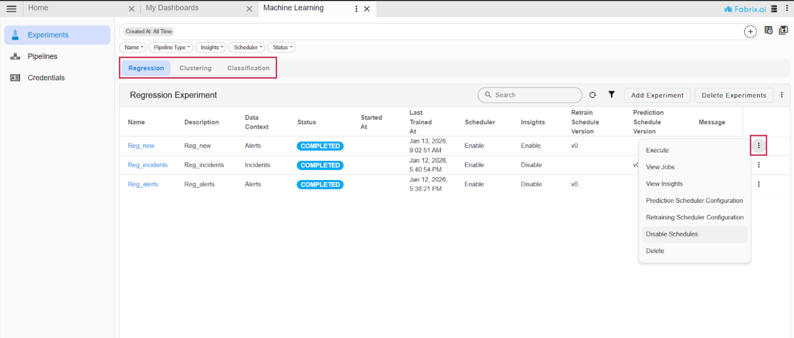 - Go to Home → Navigate to the User Dashboards → Machine Learning Page in the Experiments section, Navigate to the Regression and Clustering tabs, and disable the re-training or prediction schedules for both.