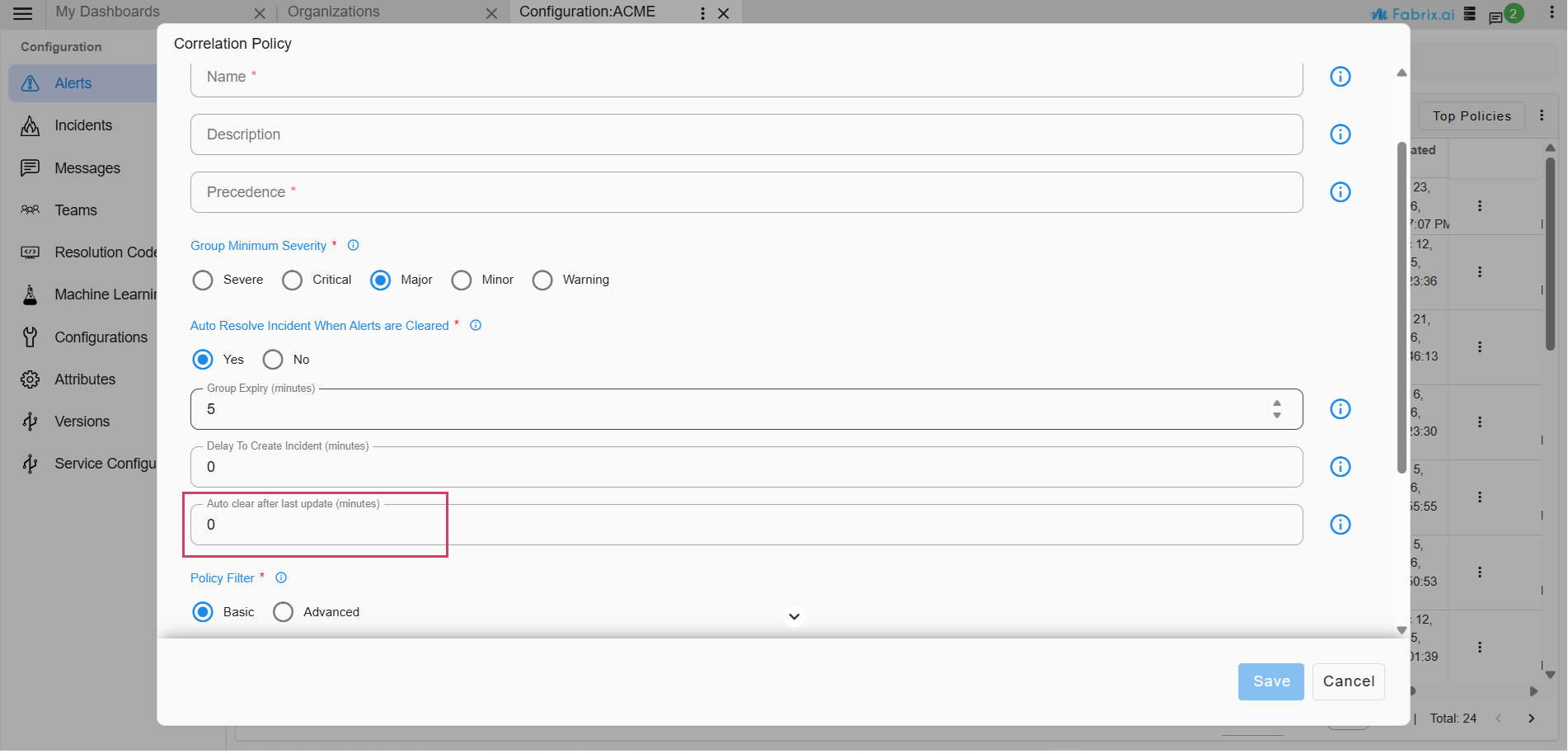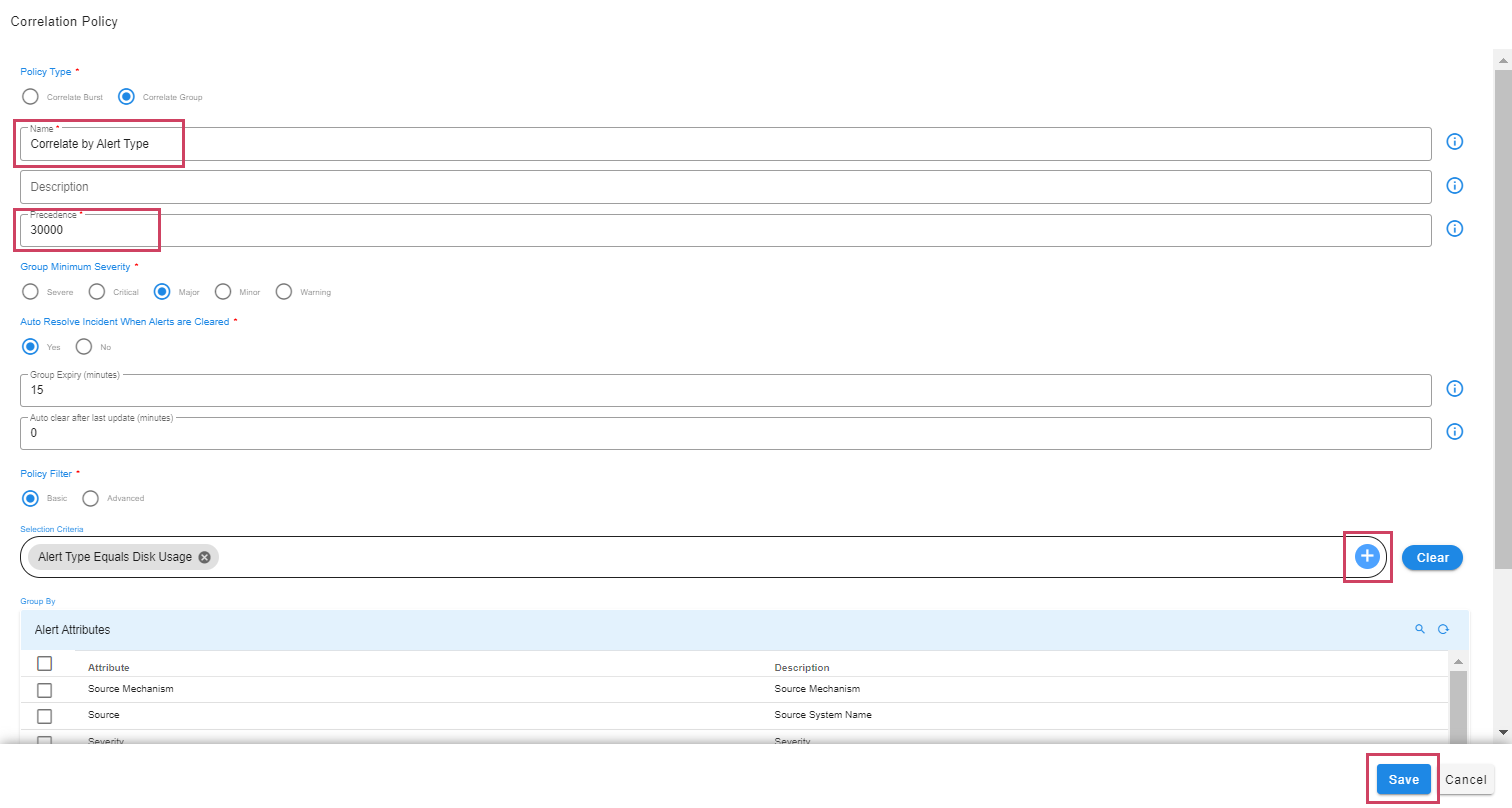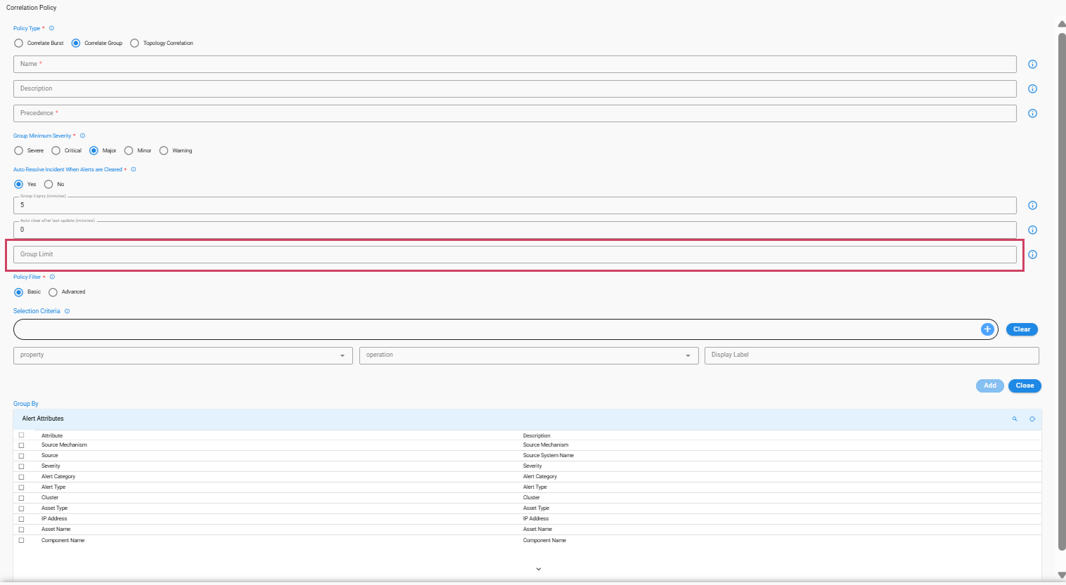 cfxOIA has an out-of-box implementation to correlate well-known operational issues related to alert burst scenarios, alert flapping situations, and transient alerts. This robust correlation engine allows the admin to implement event correlation for any type of situation, where the majority of patterns are detected with an unsupervised machine learning combined with additional flexibility for admin configurable policies to tune correlation behavior. Alerts that are correlated are called Alert Groups and the policies are called Correlation Policies.