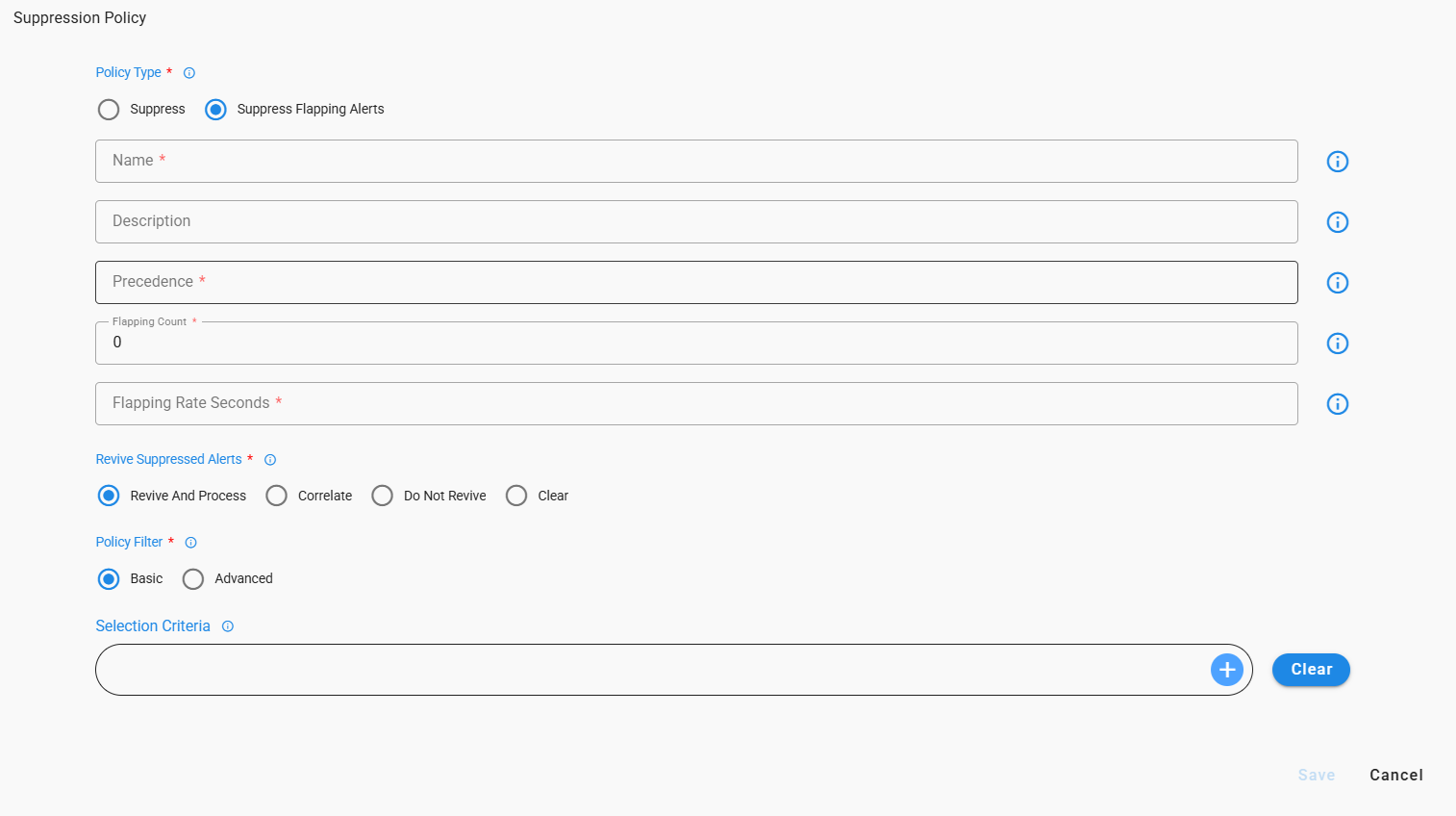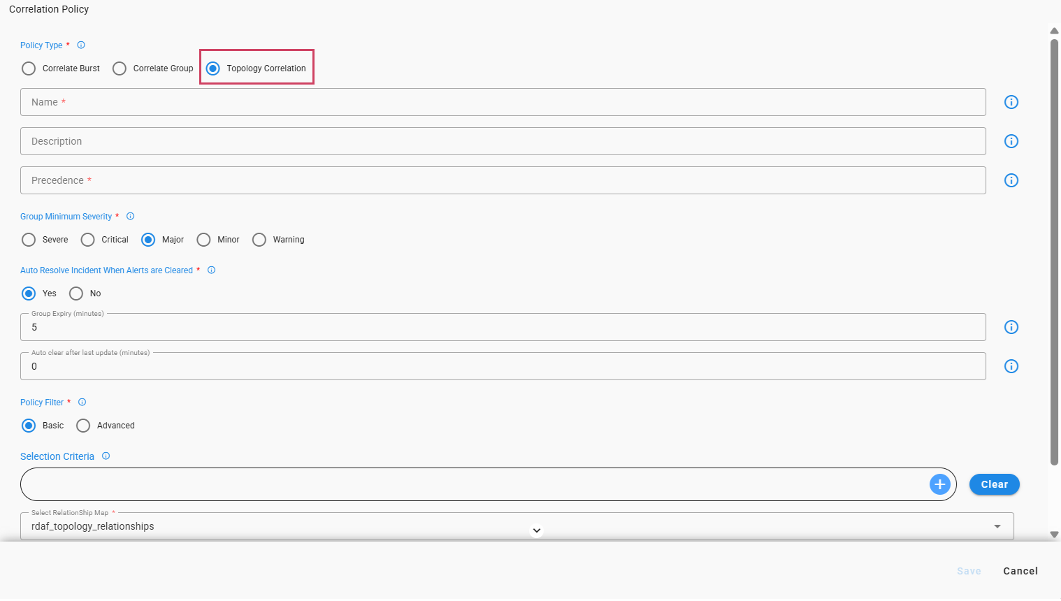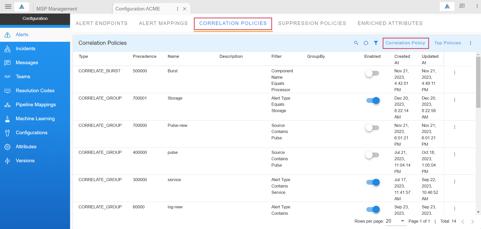 cfxOIA has an out-of-box implementation to correlate well-known operational issues related to alert burst scenarios, alert flapping situations, and transient alerts. This robust correlation engine allows the admin to implement event correlation for any type of situation, where the majority of patterns are detected with an unsupervised machine learning combined with additional flexibility for admin configurable policies to tune correlation behavior. Alerts that are correlated are called Alert Groups and the policies are called Correlation Policies.