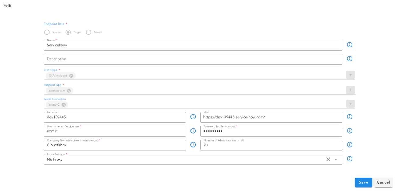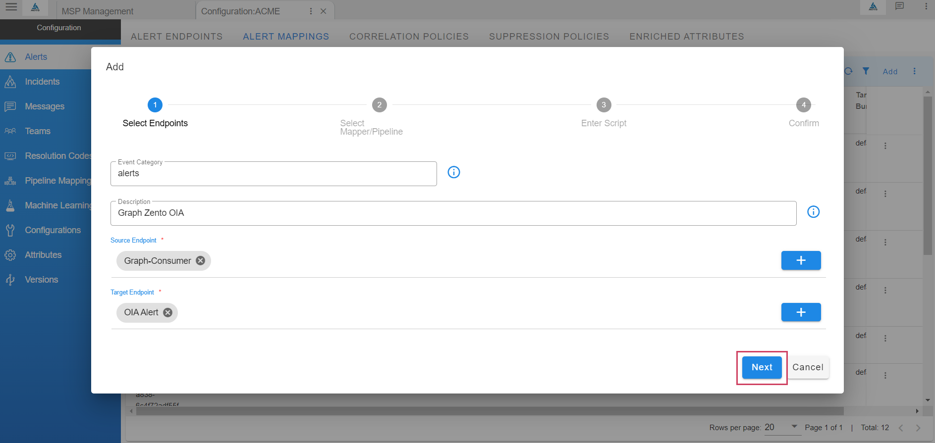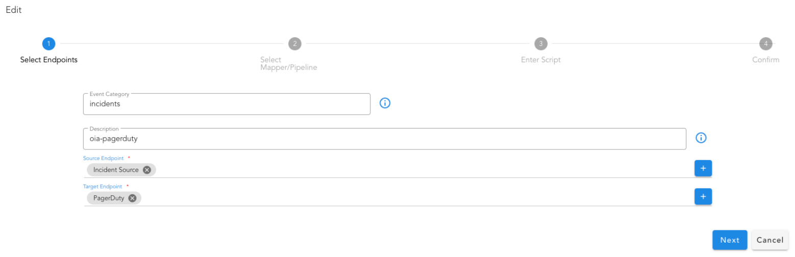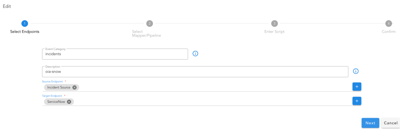 - Select the source endpoint created earlier and select OIA Alert as target to ingest the event into the system as an actionable alert. Click Next