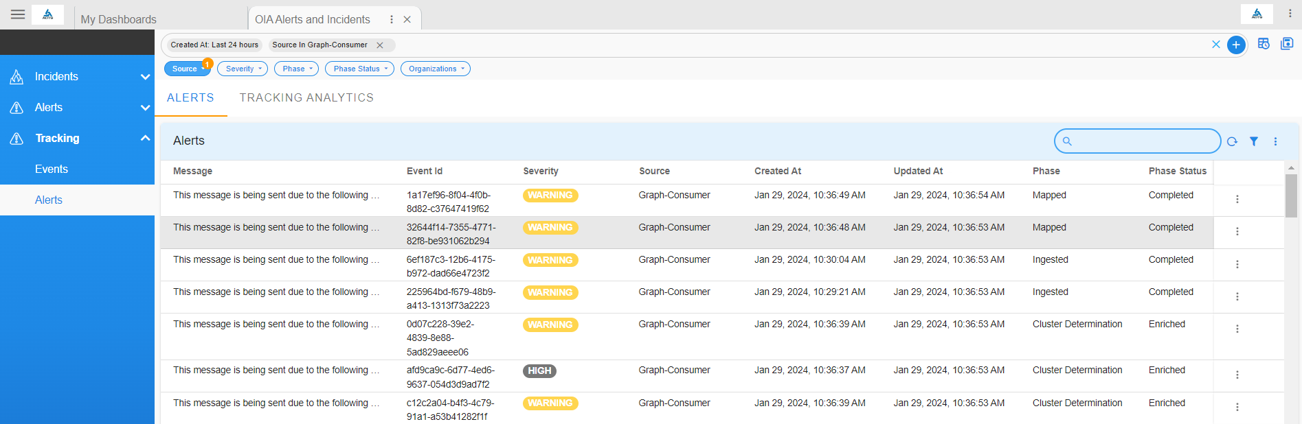 Go to Home --> User Dashboards --> select OIA Alerts and Incidents --> Click on Tracking --> Select Events