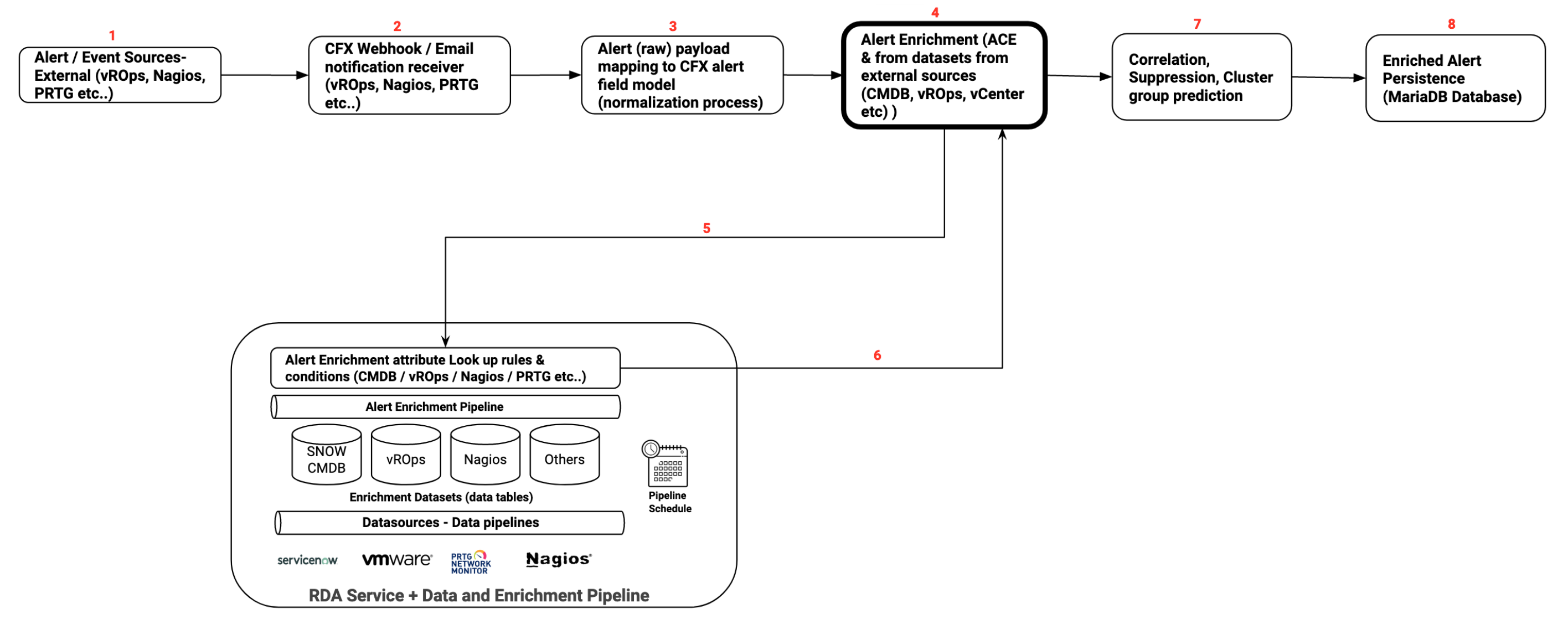 cfxOIA works by ingesting IT operational data, like alerts, events, and traces from multiple performance monitoring tools, log-based alerts from log monitoring tools and observational data from data-lakes for performing algorithmic correlation of alerts to reduce noise. OIA normalizes every alert with enrichment data established by stitching CMDB data, service mappings, and asset management data together to derive context-rich data for every alert that is ingested into the platform.