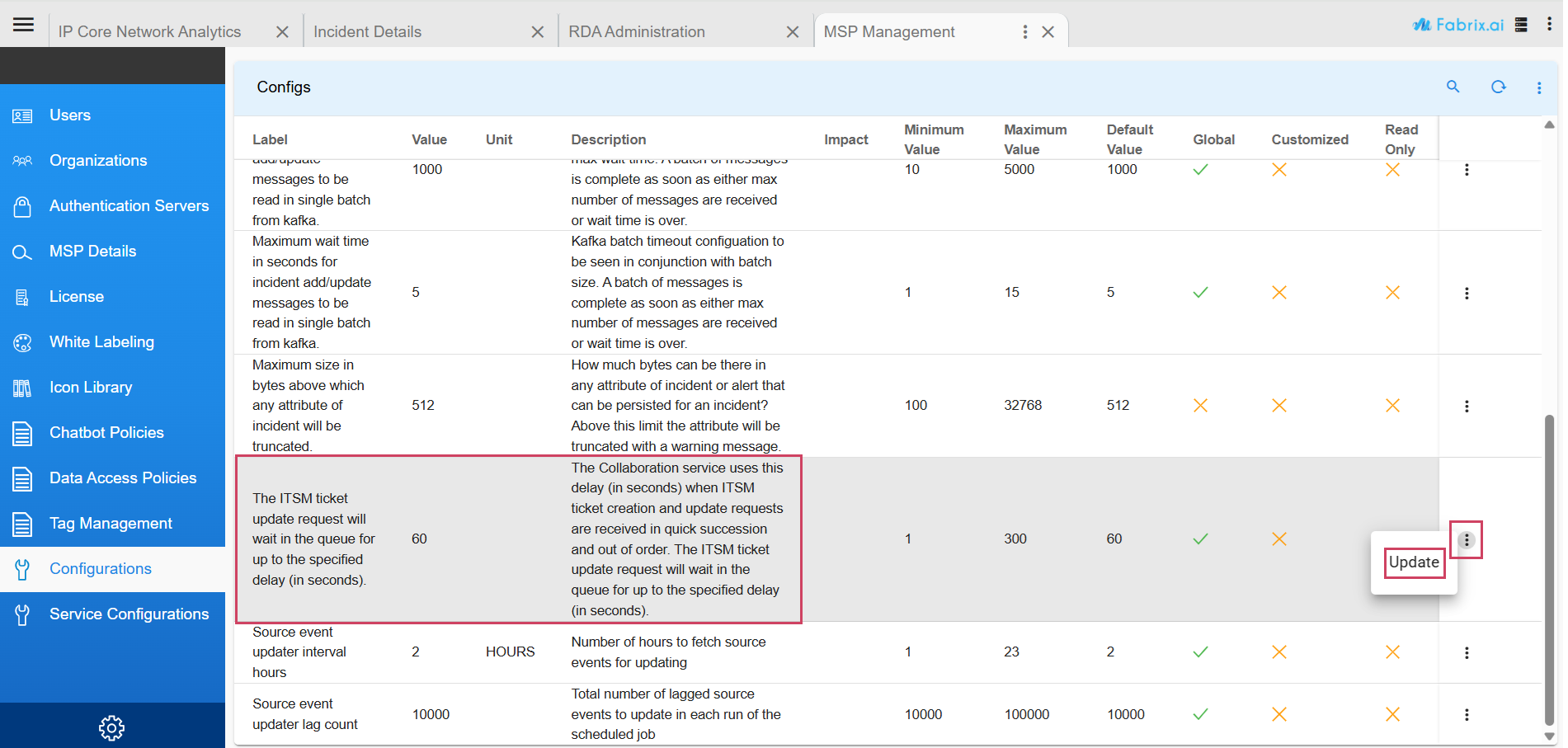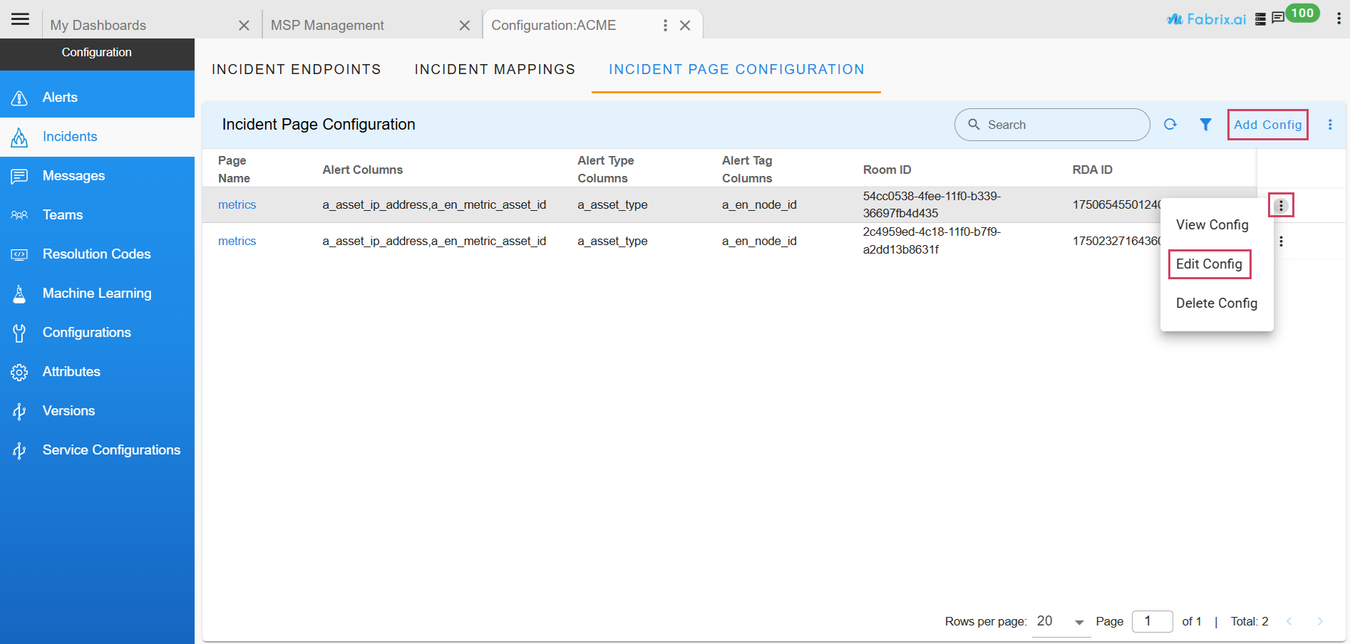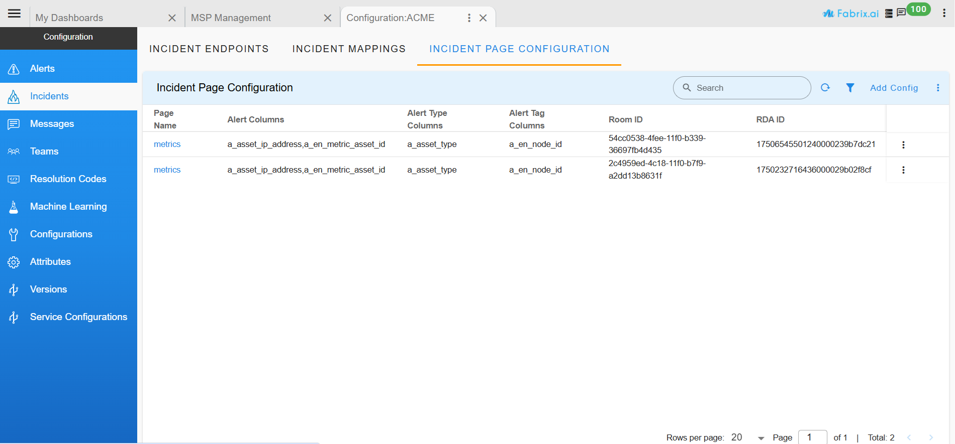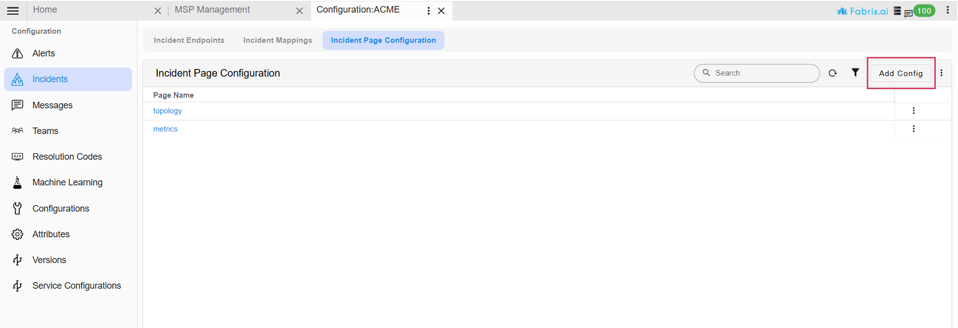- The default entry for a new organization appears as shown in the above Screenshot. From this page users can open and edit the topology configuration. For upgraded environments, existing organizations will see only a metrics entry by default; to add the incident topology configuration, click Add Config at the top-right of the page.