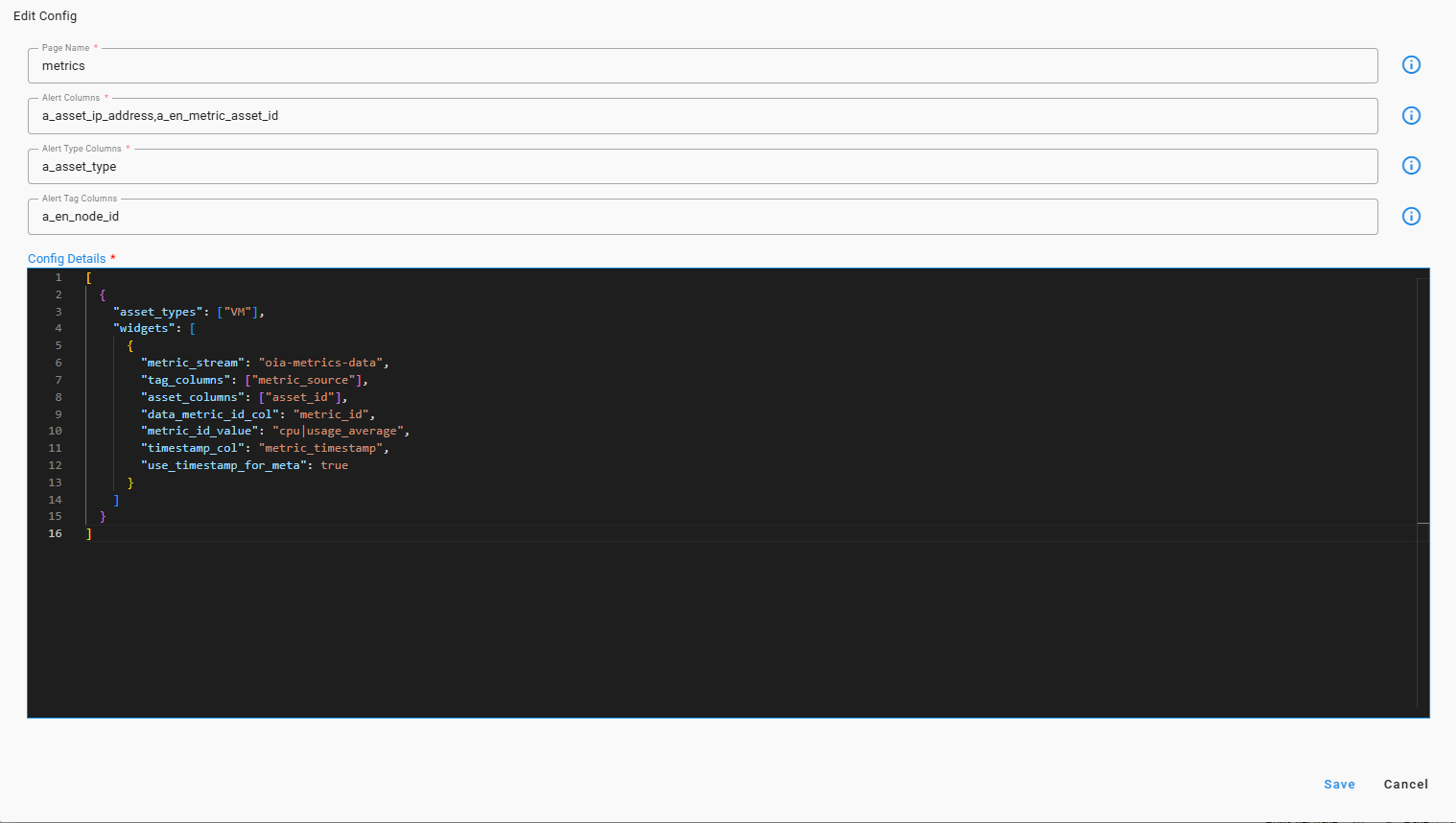 yes | Fixed-format JSON list specific to each page type. For topology, the JSON includes: a) related_alerts Configure custom labels and alert badging:i. enabled (MANDATORY, boolean): enable/disable the custom labels using related alerts.ii. related_nodes_max_distance (optional, integer): The number signifies number of hops to be included when considering the related alerts of the node. Its default value is 2.b) stack_name_col_incidents_stream (MANDATORY, string): Signifies the column name in incidents pstream which has stack name value to be used for incident topology page.c) node_id_col_incidents_stream (MANDATORY, string): column in incidents pstream containing the node id for the impacted asset.d) node_id_col_alerts_stream (MANDATORY, string): Specifies the column name in the incidents pstream that contains the node ID of the topology node which is the primary impacted asset for this incident.e) stack_details — Contains nested details specifying which stack to display on the incident topology page and its configuration:i. type Defines the stack location to use. Valid values are "use_context", "fixed", and "dynamic". The required additional fields vary by value. Detailed examples follow, and all applicable fields are described below for reference.ii. context_field_for_stack_name Applicable only when type="use_context". Specifies the attribute name in the incoming UI context (on page load) that contains the stack name.iii. stack_name This is applicable only if type=”fixed”. This field defines the name of the stack and that is a pre-defined stack in the list of stacks in the app.iv. stack_definition This is applicable only if type=”dynamic”. Under this field the complete stack is defined.The details of the stack definition fields is out of scope of this section. Look at the example provided below for suggestions. |