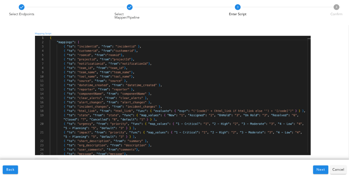 - Use the contents from the downloaded source payload as input. Create a JSON mapping definition to translate the input to the system identifiable alert.