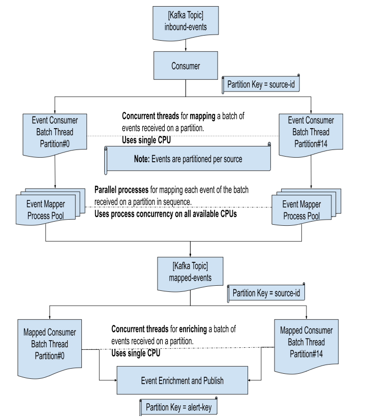The results of mapping are collected sequentially, thereby retaining the order of events; and published to Kafka topic mapped-events. The publisher again uses the ID of the source, where the event is received; as a partition-key for the Kafka topic