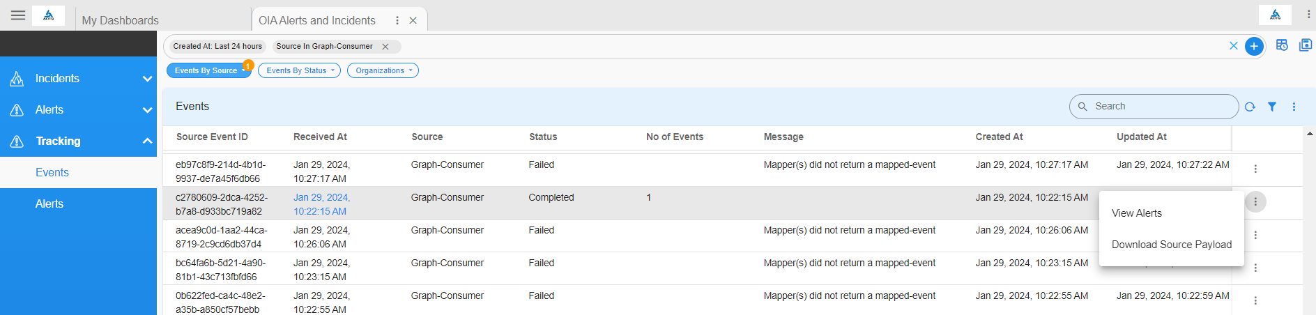 View the alert created from the incoming event by navigating to the dashboard OIA Alerts and Incidents, and under the Events tab select View Alerts for the incoming event