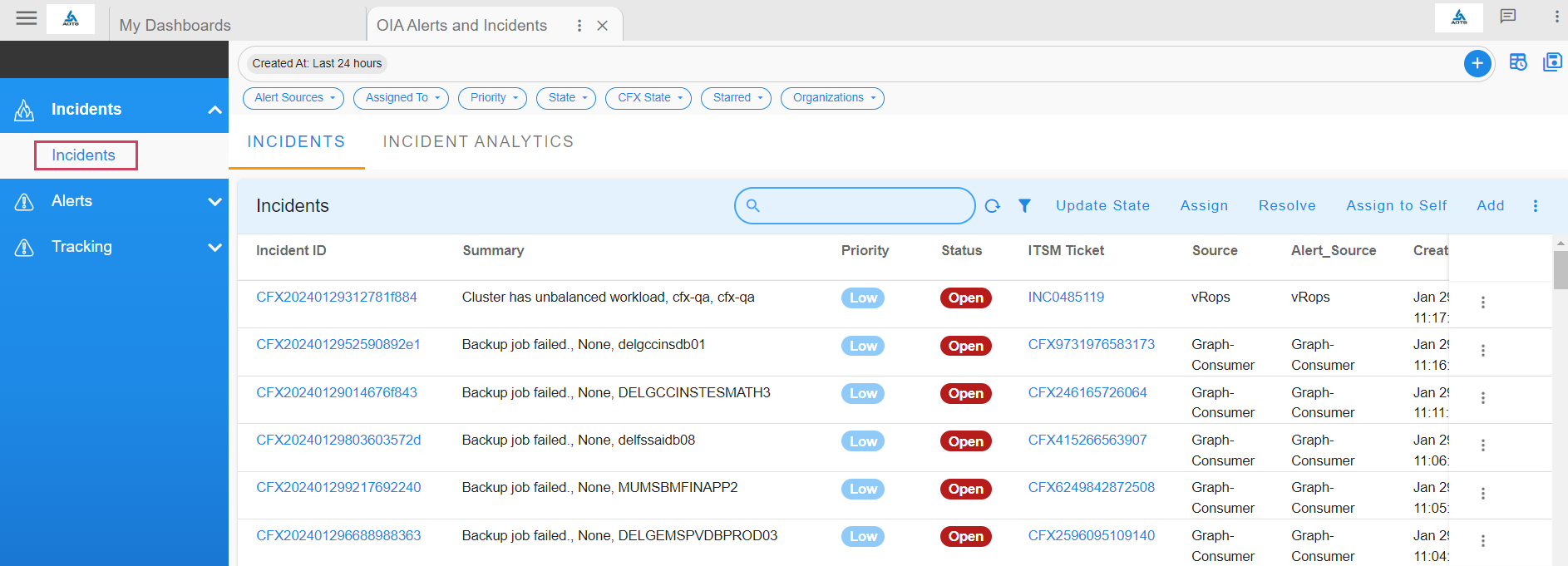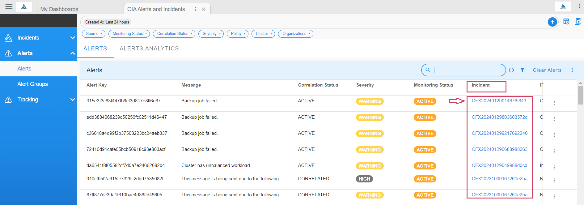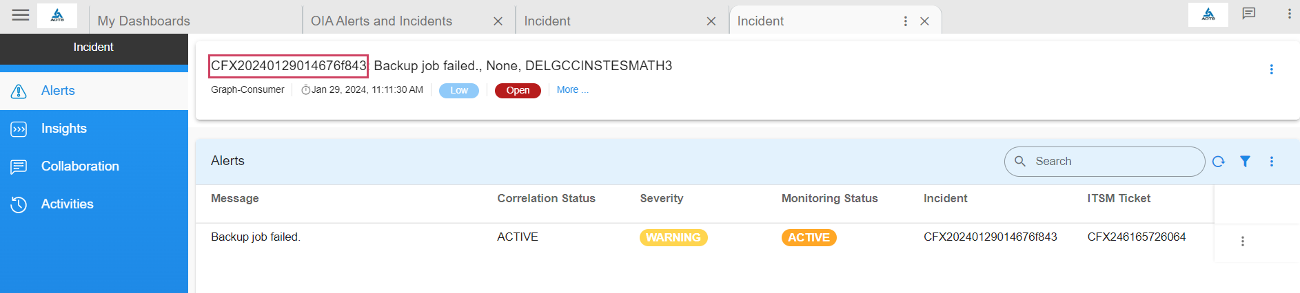 Deduplicated and correlated alerts are grouped in an Alert Group that indicates an active operational issue or an OIA Incident. Every Alert Group has one OIA Incident, which is sent to the ITSM systems (like ServiceNow, PagerDuty, etc,.) and to OIA Incident Room for further Incident processing.