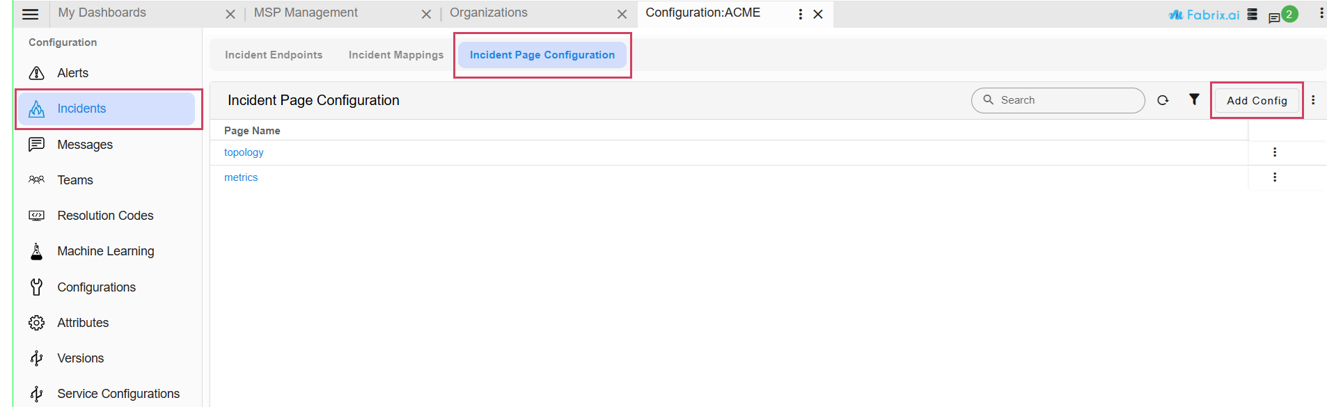 Navigate to Home → Configuration -> Apps Administration -> Select Respective Organization row level clik on Configure -> Incidents -> Incidents Page Configuration -> Add Config -> add a Page Name and the config details -> Save