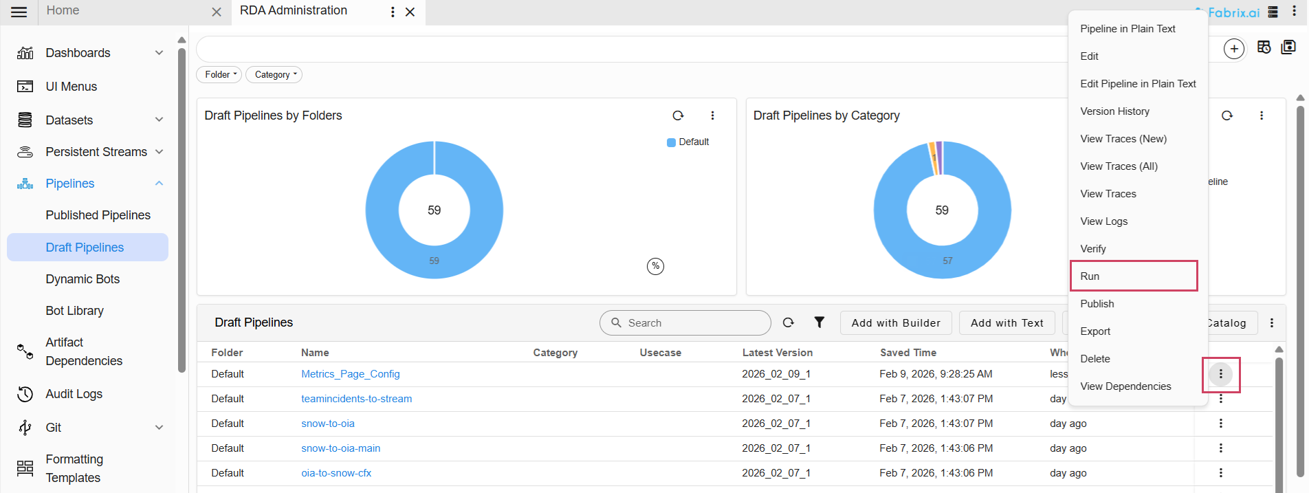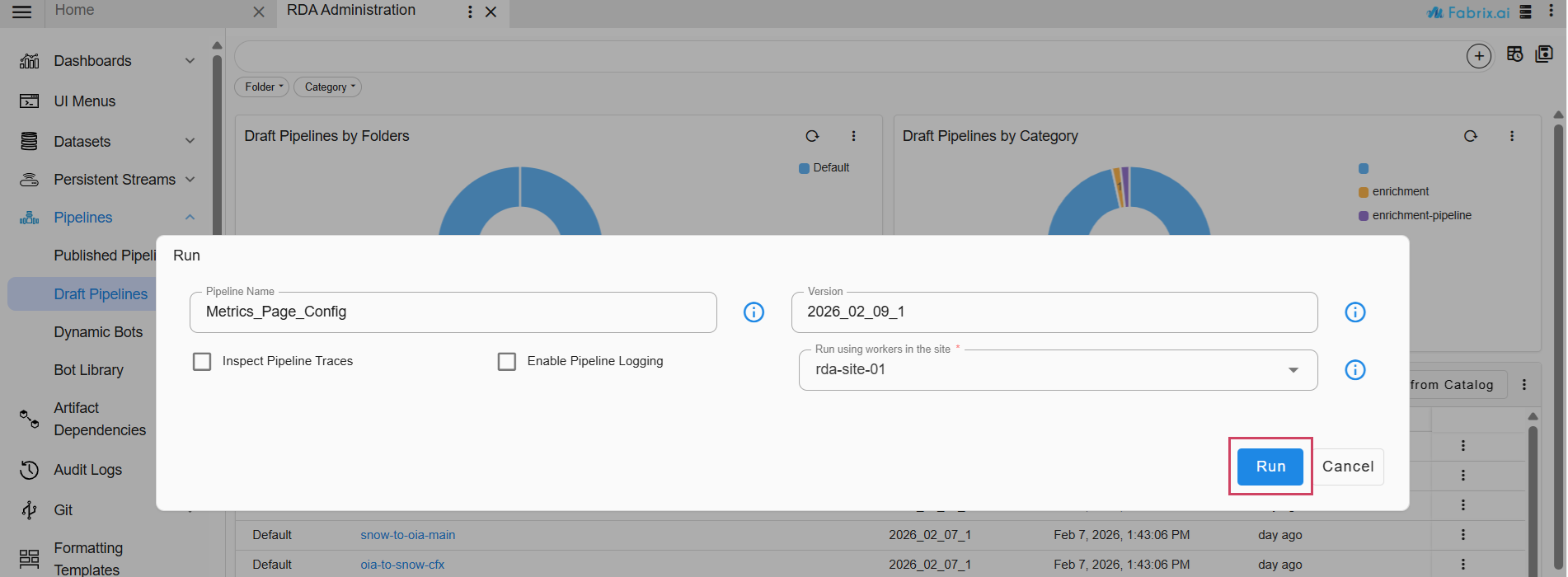 - Navigation Path : Go to Home → Navigate to the Configuration -> RDA Administration -> Pipelines -> Draft Pipelines -> Add with Text Give the Pipeline Name -> Version -> copy the below given Pipeline and Save -> Click on Run as shown in the screenshot below.