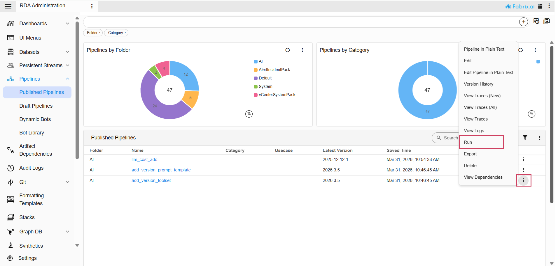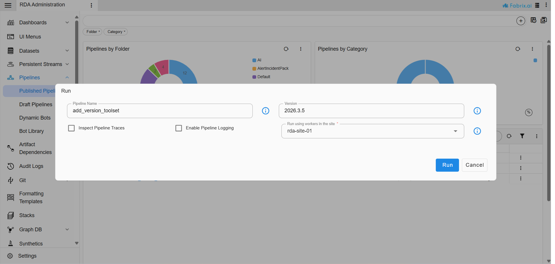 Navigation Path : Go to Main Menu → Configuration → RDA Administration → Pipelines -> Published Pipelines -> click the three-dot menu next to the desired pipeline -> select Run. If necessary, enable "Inspect Pipeline Traces" for further debugging. Please ensure that each pipeline completes successfully before proceeding.