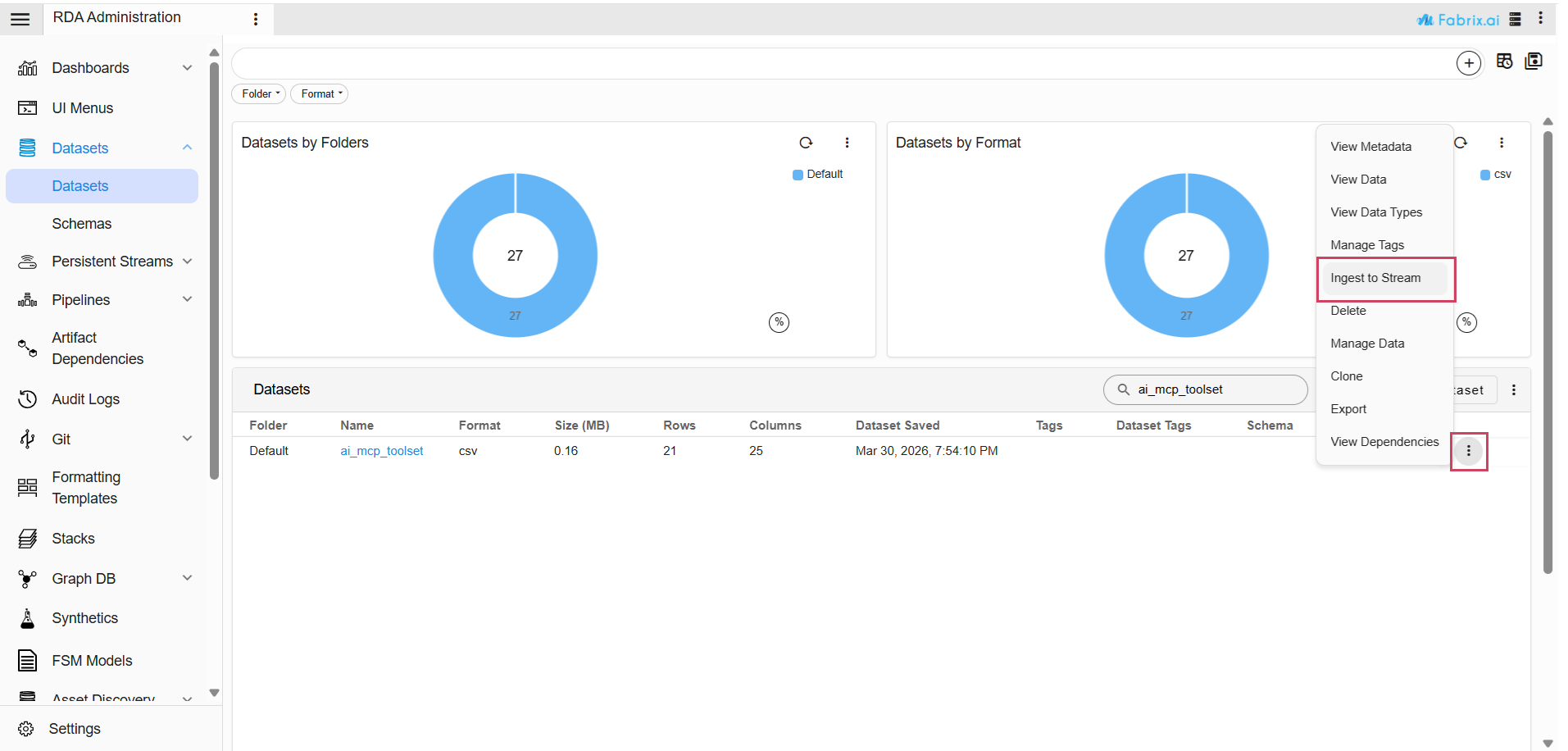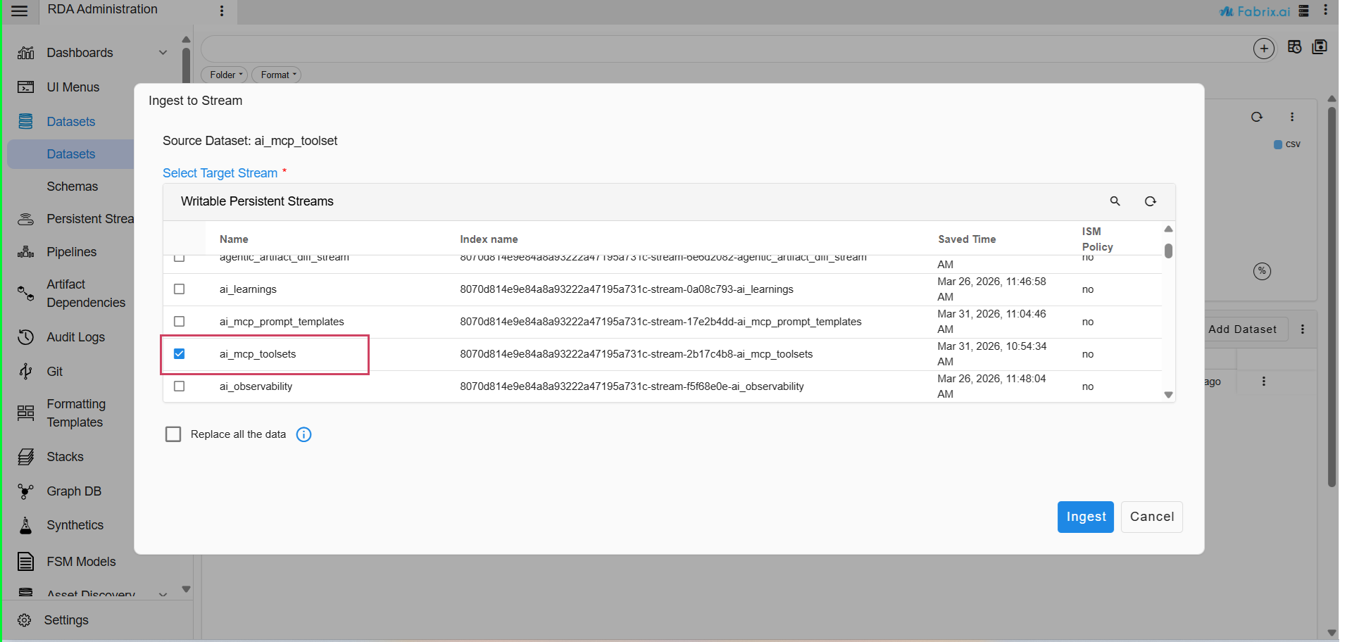 Navigation Path : Go to Main Menu → Configuration → RDA Administration → Datasets → Select the Dataset -> Click on Ingest to Stream -> Click on Ingest as shown in the below screenshot